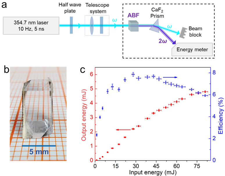 Figure: High-efficiency frequency doubling output of ABF. (a) Schematic of the setup for 177.3 nm high-energy VUV nanosecond laser generation in ABF. (b) Device fabricated with phase-matching angle for SHG at 354.7→177.3 nm. (c) Output energy and conversion efficiency for SHG at 354.7→177.3 nm. (Images provided by Shilie Pan’s group.)
