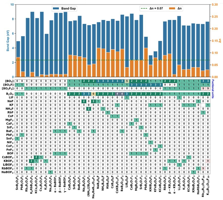 The Crystal Materials Research Center at the Xinjiang Technical Institute of Physics and Chemistry, Chinese Academy of Sciences (XTIPC), has proposed the "functional unit ratio design" principle. Based on this principle, they have screened and designed advantageous fluorinated building unit configurations. Focusing on the system comprising π-conjugated [BO3] and non-π-conjugated [BO2F2], they successfully designed two novel fluorooxoborate materials: LiB3O4F2 and Li2B4O5F4. For the LiB3O4F2 composition, 26 candidate structures were obtained, and for the Li2B4O5F4 composition, 9 candidate structures were obtained.